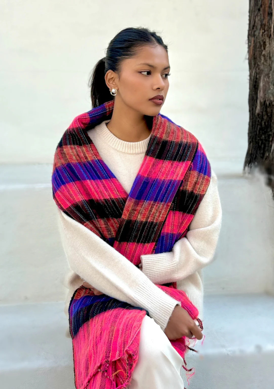 Met zorg handgeweven in Nepal is deze sjaal soepel, warm en comfortabel. De mix van 70% schapenwol en 30% acryl zorgt voor stevigheid, kleurechtheid en een prettig ademend vermogen. Dankzij het lichte gewicht neem je hem moeiteloos overal mee naartoe – ideaal voor koude dagen.