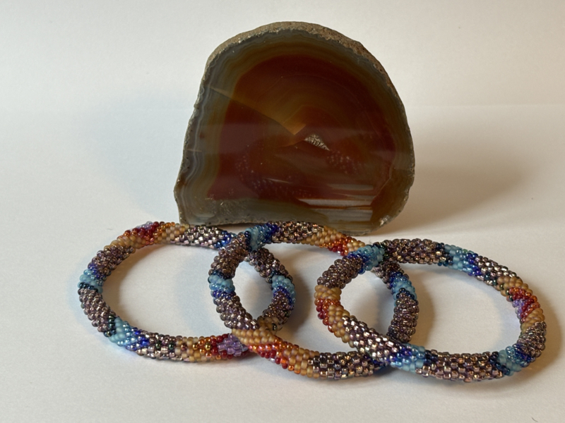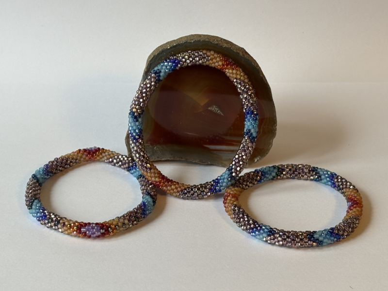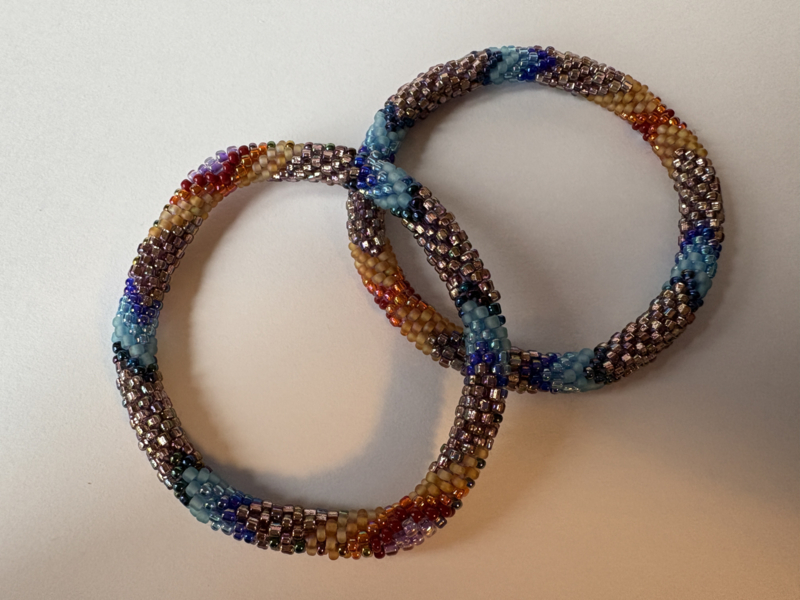 Elke armband wordt door één van de kunstenaressen met de hand geregen tot een zogeheten "roll-on" armband, zodat vorm en ontwerp perfect tot hun recht komen.