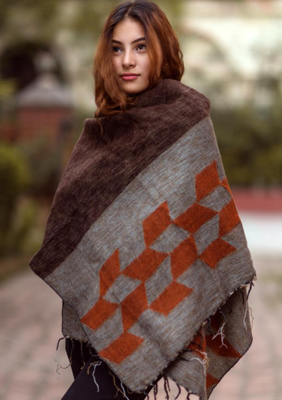 Deze wollen sjaal is handgeweven in Nepal en is soepel, zacht en heel warm. De combinatie van 70% schapenwol en 30% acryl maken het product sterk en kleurecht. Het materiaal heeft een hoge "ademhalingsfactor". Deze speciaal handgeweven wollen sjaal is ontworpen in een trapeziumpatroon dat deze sjaal bijzonder mooi en aantrekkelijk maakt.