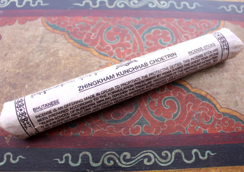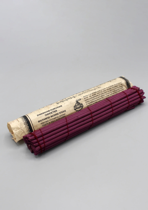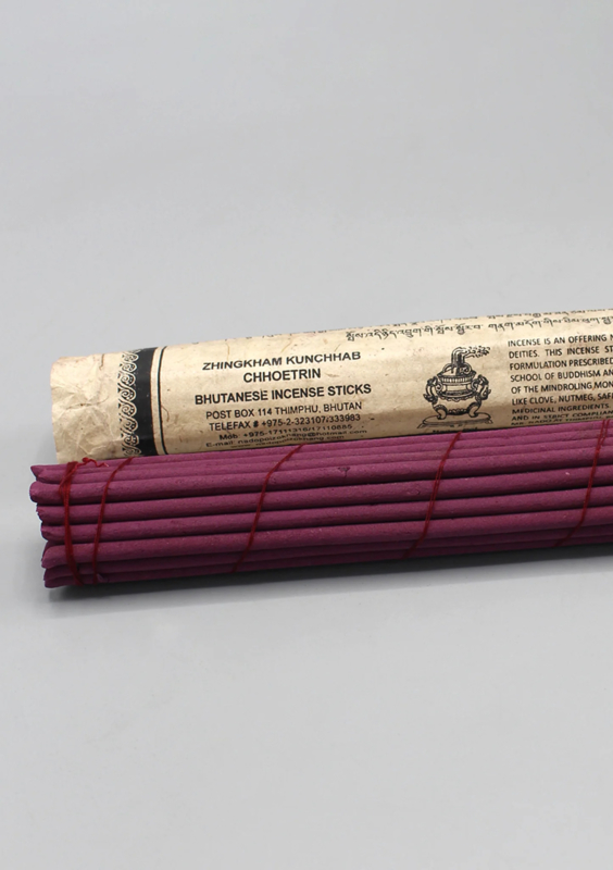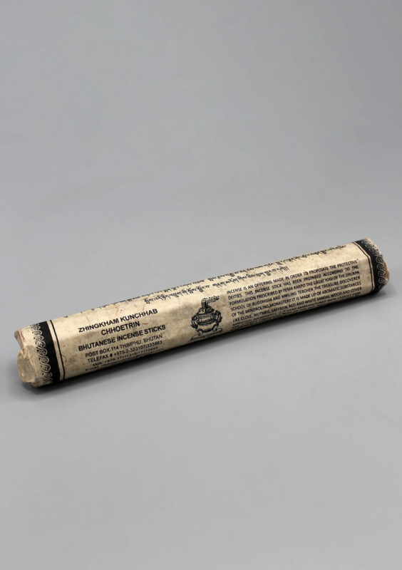 Weihrauch ist eine Opfergabe zur Besänftigung der Schutzgottheiten. Dieser Weihrauch wird nach der Formel hergestellt, die von Pema Karpo, dem großen Yogi der Drukpen-Schule des Buddhismus, und Minling Terchen, dem Schatzentdecker des Mindroling-Klosters, vorgeschrieben wurde. Es besteht aus aromatischen Substanzen wie Nelken, Muskatnuss, Safran, rotem und weißem Sandelholz und anderen medizinischen Inhaltsstoffen. Es wird mit größter Sorgfalt und unter strikter Einhaltung einer jahrhundertealten traditionellen Methode handgefertigt.