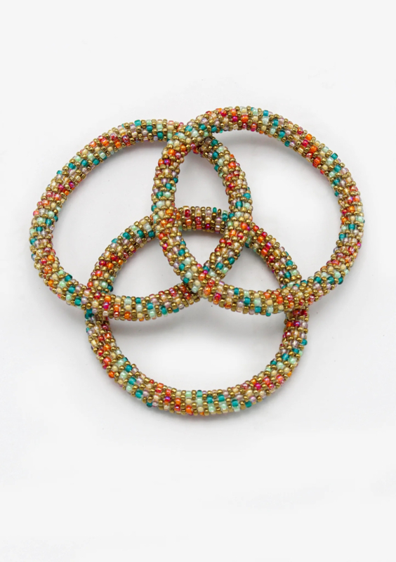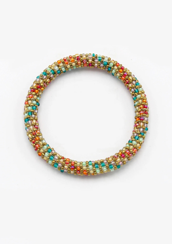 Each bracelet is carefully hand-strung by one of the artisans into a so-called “roll-on” bracelet, allowing the shape and design to stand out beautifully.